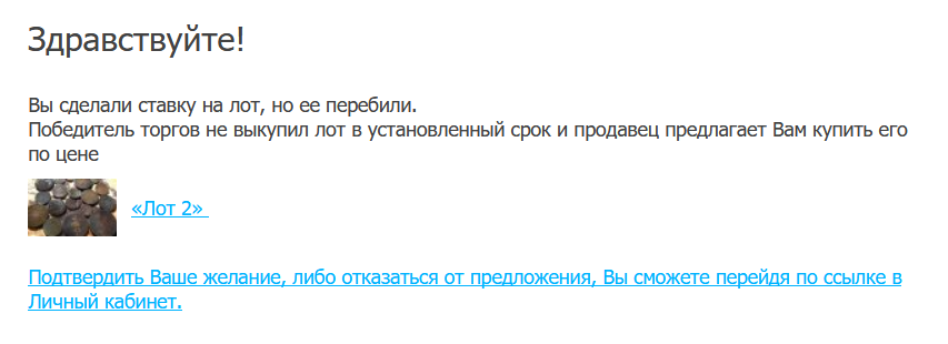 Если победитель торгов отказался покупать выигранный лот или не выходит на связь в течение трёх дней, у продавца есть возможность предложить покупку предыдущему лидеру торгов.