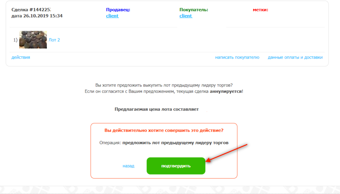 Нажав подтвердить, предыдущему лидеру торгов будет отправлено предложение: