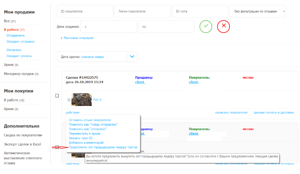 Если покупатель согласится выкупить лот, будет сформирована новая сделка.