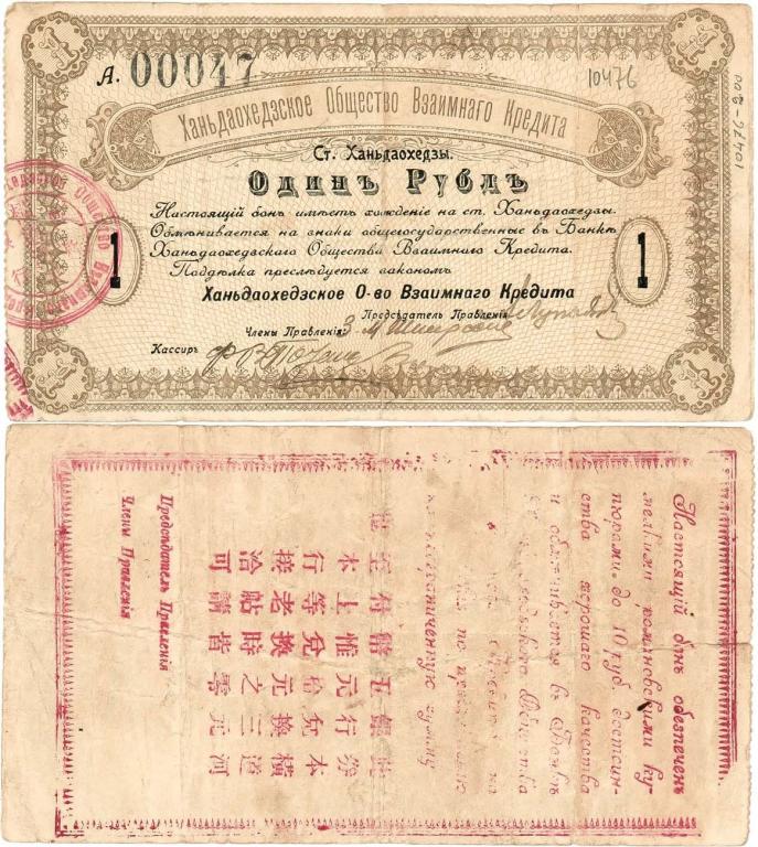 1 рубль 1918 г Ханьдаохедзы "Ханьдаохедзкое Общество Взаимного Кредита". Низкий номер. АКЦЕПТ!