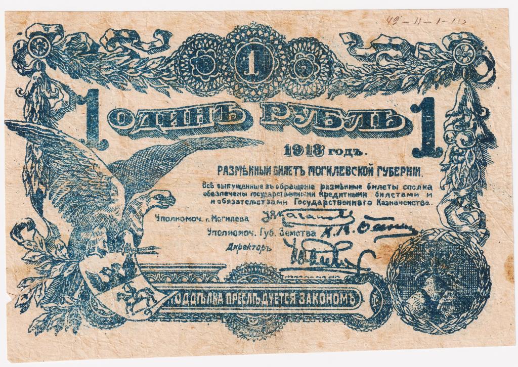 1 рубль 1918. Могилев. Губернская управа. Разменный билет. Кассир Русанов. С номером. № 002579