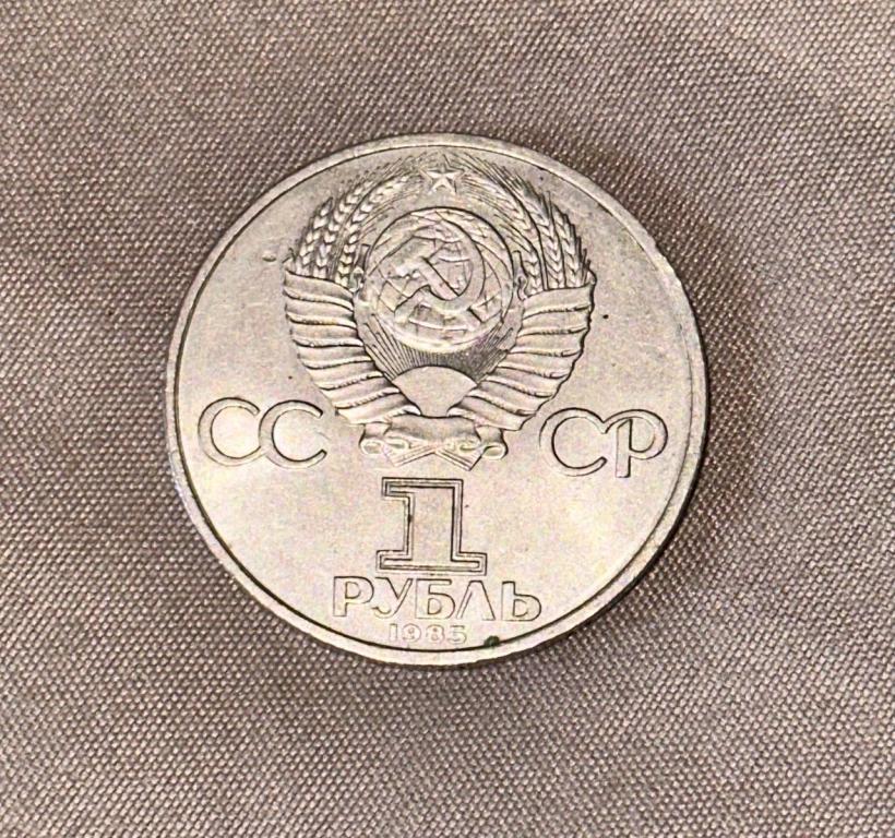 Сверху герб СССР с 15 витками ленты, слева от него буквы «СС», справа «СР», ниже обозначение достоинства монеты цифра «1» и ниже слово «РУБЛЬ», внизу у канта год выпуска монеты «1985».