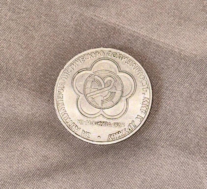 В центре изображение эмблемы фестиваля. Под изображением эмблемы надпись «XII - МОСКВА - 1985». По окружности надпись «ЗА АНТИИМПЕРИАЛИСТИЧЕСКУЮ СОЛИДАРНОСТЬ, МИР И ДРУЖБУ», выражающая девиз фестиваля и заканчивающаяся точкой.