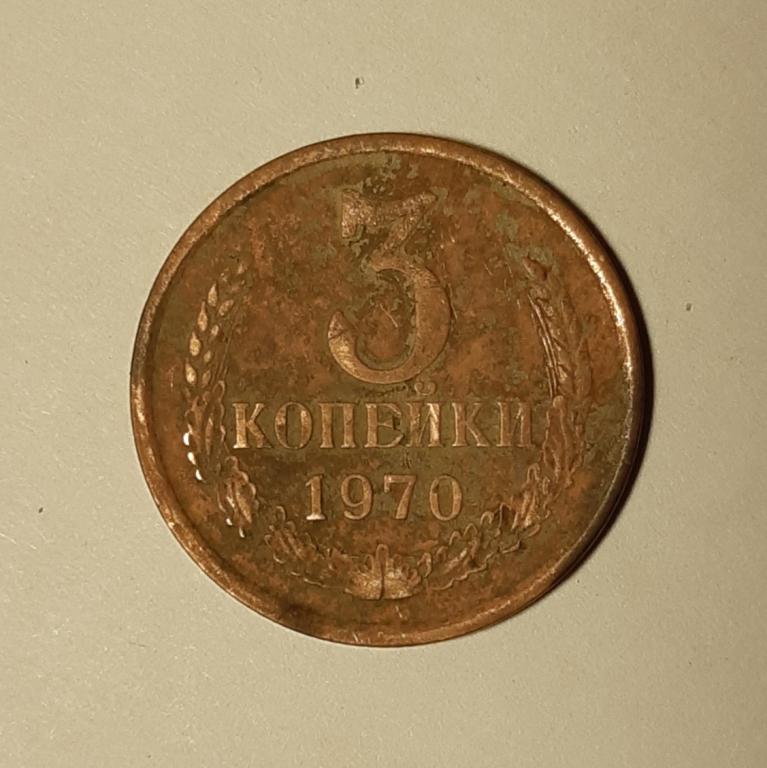 3 копейки 1970 года. Л.ст. шт. 2.2 Ф-93 - справа от звезды внешняя гребенка остей с уступом, поверхность витков ленты вогнутая, зазоры между витками ленты узкие.
