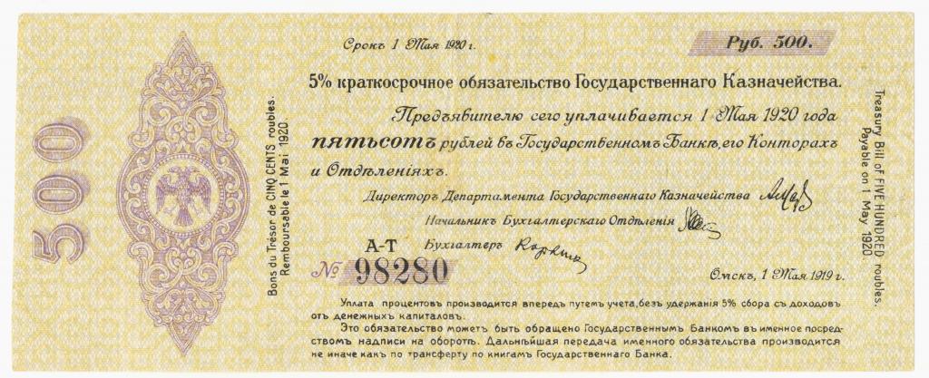 500 рублей июль 1919 Омск. 5% краткосрочное обязательство Государственного Казначейства. Колчак. № 126818