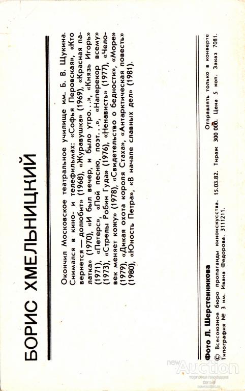 Купите "Артист кино Борис Хмельницкий" по цене 10a.Покупайте сейчас, чтобы не упустить эту отличную цену на “Auction.ru” или сделайте свое предложение продавцу.
