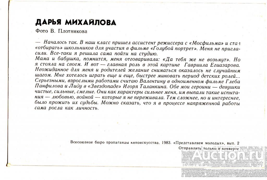 Купите "Артистка кино Дарья Михайлова" по цене 10a.Покупайте сейчас, чтобы не упустить эту отличную цену на “Auction.ru” или сделайте свое предложение продавцу.