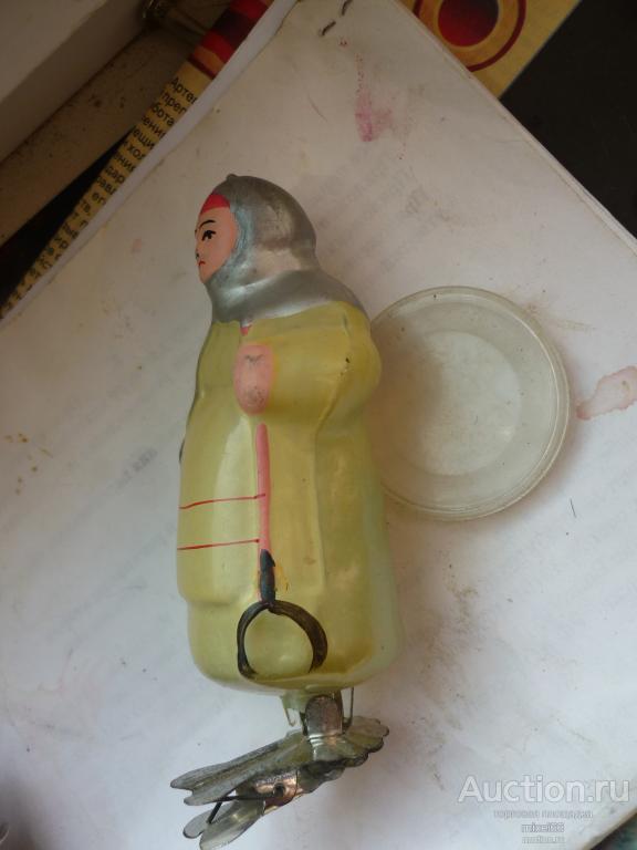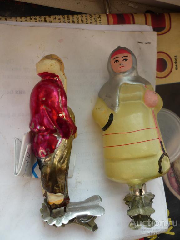 Стекляная игрушка 2 персонажа из стекла высотой = 12см - в хорошем состоянии. у дедушки в нижней части фрагментарно(чуть чуть) осыпалась краска, имеется скольчик у держателя