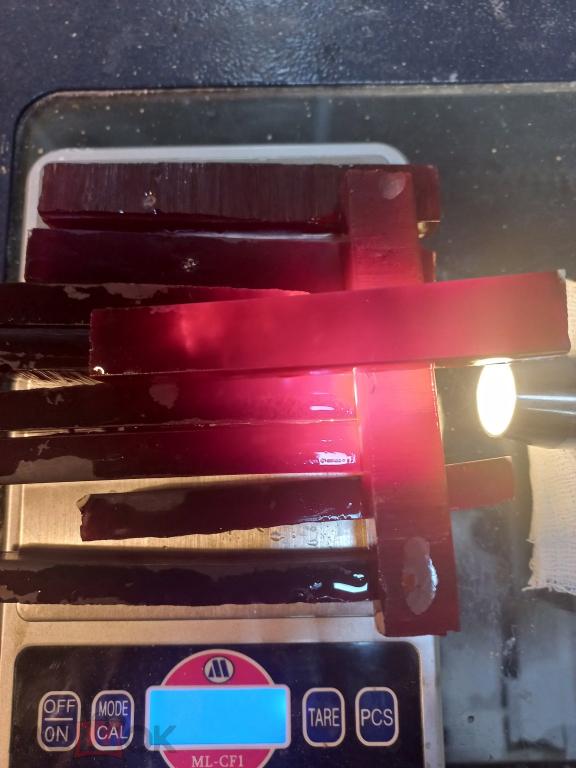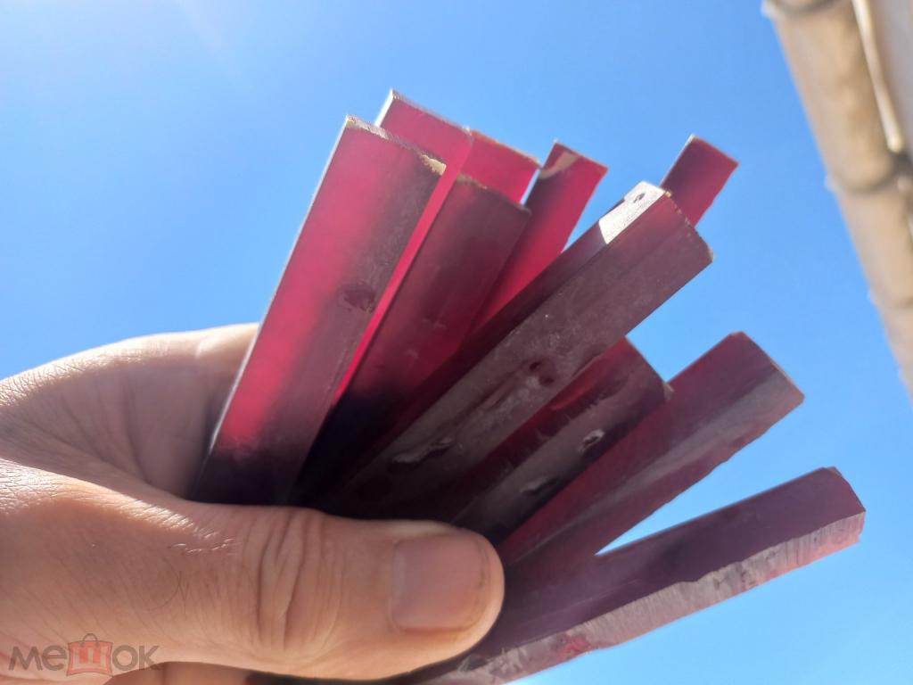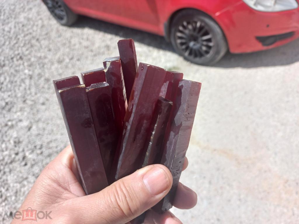 Бакелит цвета ВИШНИ. Прозрачный. По цене - 12 рублей за грамм. Без наполнителей. На просвет буро-КРАСНЫЙ прозрачный если просвечивать фонариком (смотрите фото). 10 брусков общим весом - 143 грамма. Сечение брусков 9 на14 мм, среднем (+- 1 мм). Длина 90 -93 мм. на наружных уголках белые пятнышки - это поверхностная технологическая отметина. Они только по углам.