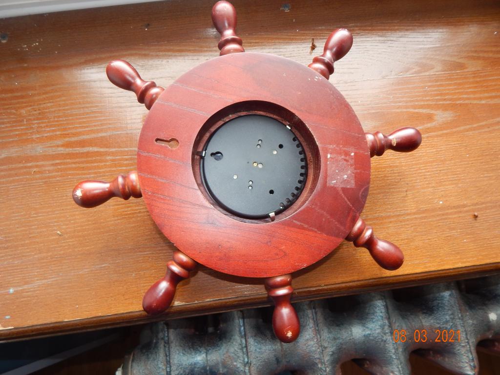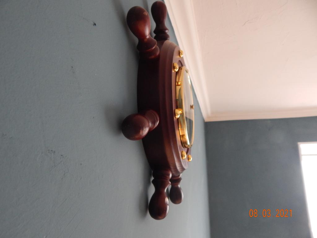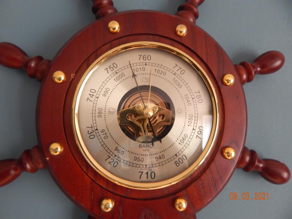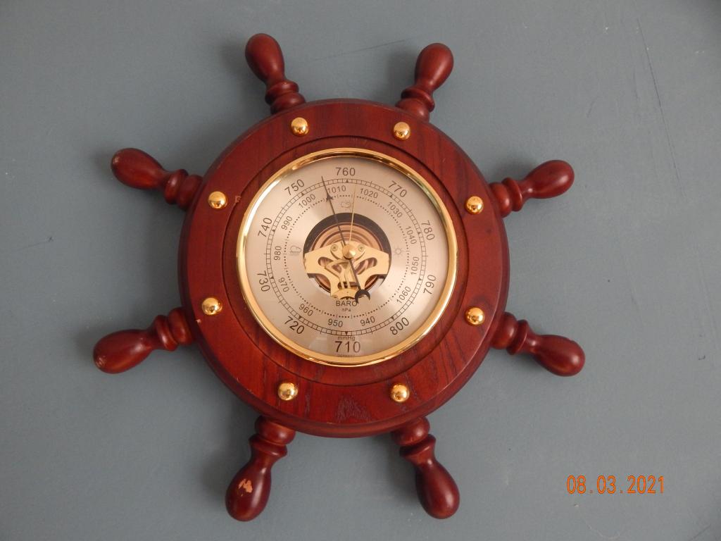 Барометр настенный в виде штурвала, корпус дерево. Максимальный диаметр корпуса 32 см, циферблат 13 см. Полностью рабочий.