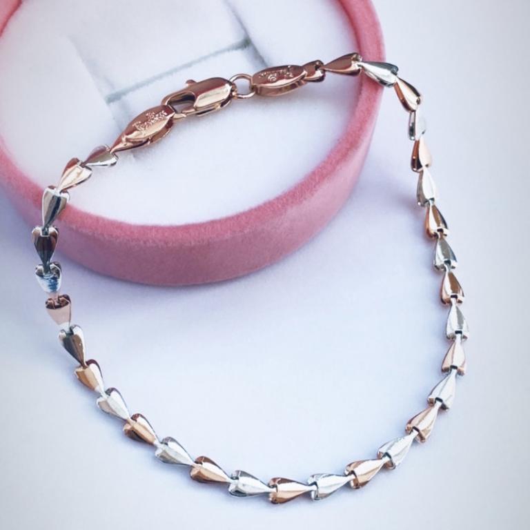 Нежный браслет, сочетающий в себе цвета платинового и золотого металла, состоит из множества небольших сердечек. Великолепная игра оттенков и фантазийная форма призваны добавить утончённой элегантности образу своей обладательницы. Этот браслет непременно будет гармоничным дополнением индивидуального стиля, а также сможет послужить отличным подарком для любительницы необычных украшений.