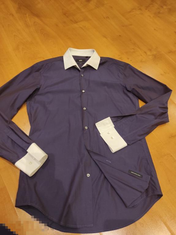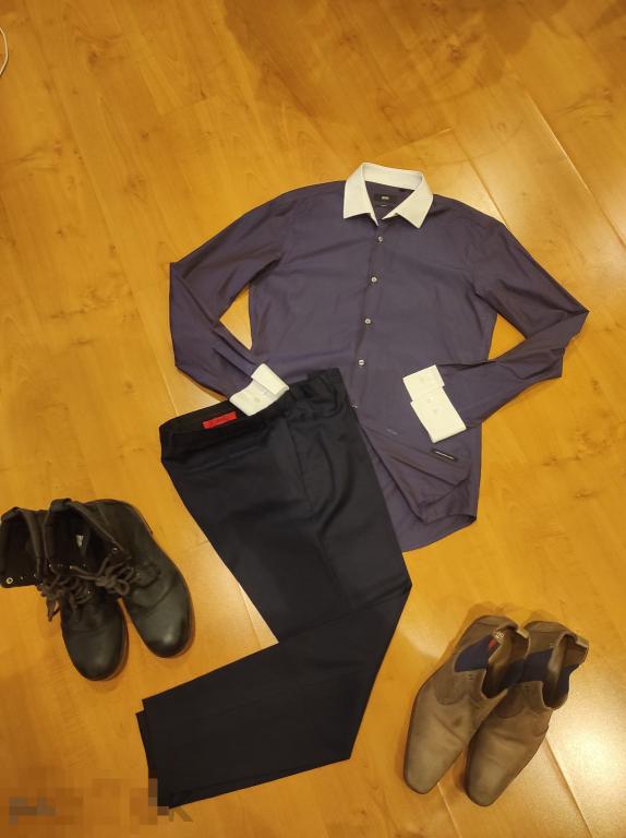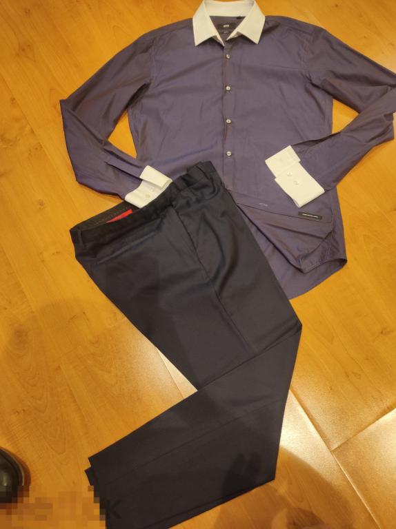 брюки зауженные Слим фит 100%, не подшитые, 100% virgin wool, тончайшая шерсть, цвет темно синий, размер 50, пояс 44, длина 100см, б/у состояние хорошее. 800 руб. Рубашка необыкновенного цвета синий с сливовым отливом, как хамелеон. Слим фит, ворот 39,хлопок, итальянская ткань, состояние новой.1000 руб