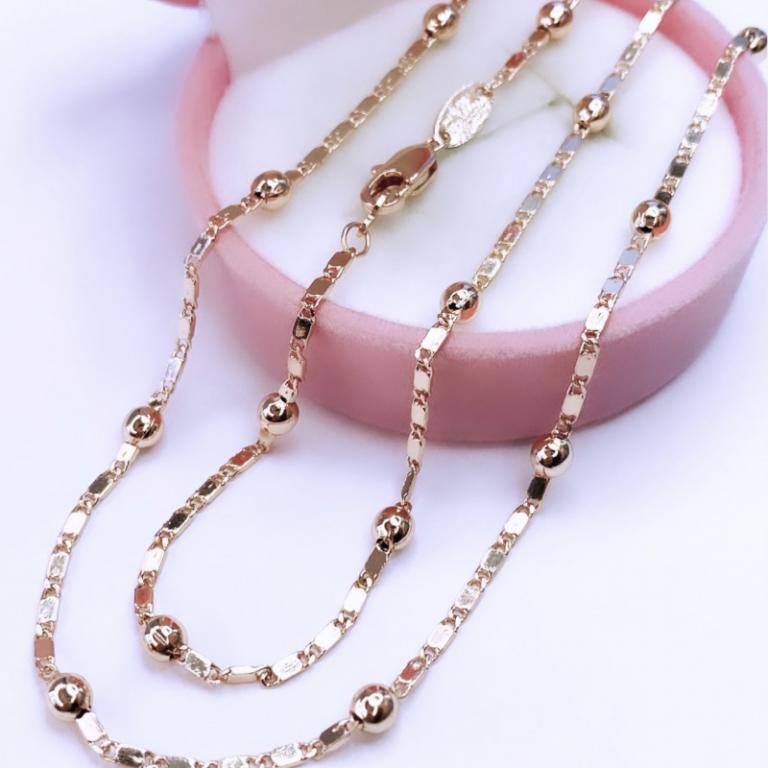 Лаконичный облик этой цепи оценят любительницы стильных и сдержанных украшений. Строгое плетение звеньев перемежается с небольшими вкраплениями из золотистого металла в форме шариков. Такая цепь самодостаточна и может выступать самостоятельным украшением, подчёркивая деловой стиль и прекрасный вкус своей обладательницы.