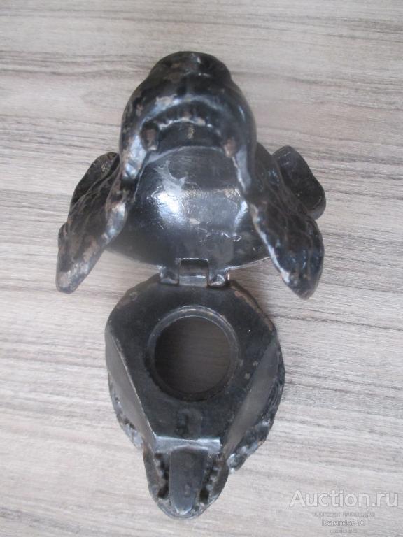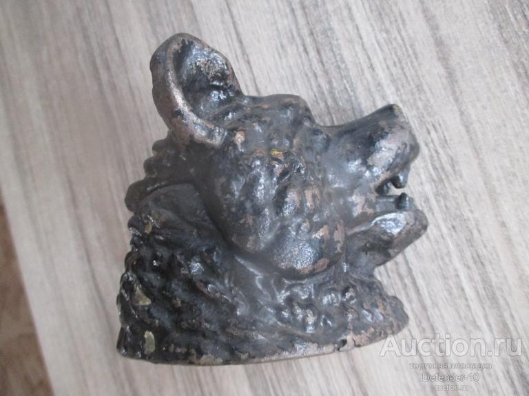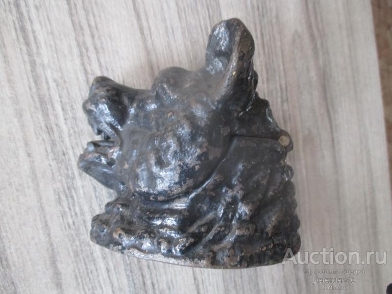ЧЕРНИЛЬНИЦА ГОЛОВА МЕДВЕДЯ ЧУГУН КЛЕЙМО СЧЛЗ 1950е г ОСНОВАНИЕ 9,8 НА 9 СМ ВЫСОТА 9,5 СМ. Немного потерт временем. Родная краска. нет стеклянной чернильницы. Без дефектов, без вмешательств. Встречается уже не так часто.