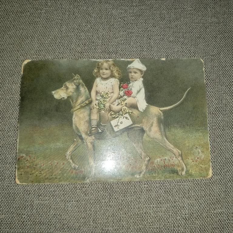 Старинная открытка "Дети, сидящие на собаке". Есть надлом! Начало ХХ в.