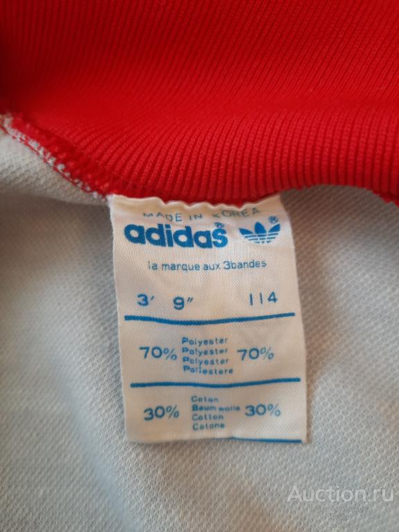 Детский винтажный костюм Adidas. Размер 114, длина олимпийки 43 см, ПОГ 34 см, полуобхват внизу 25 см. Длина брюк по внешнему шву 68 см, по внутреннему шву 53 см, ПОТ 27 см. Состав: 70% полиэстер, 30% хлопок. Б/У.