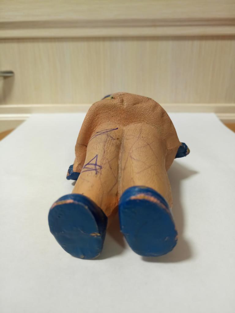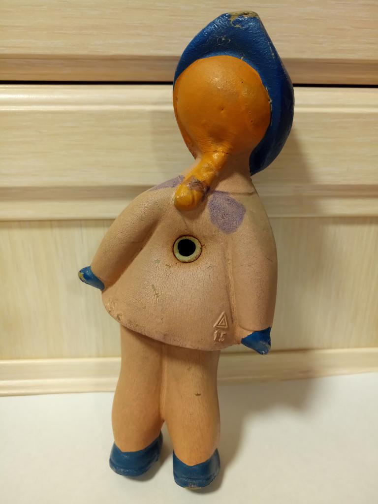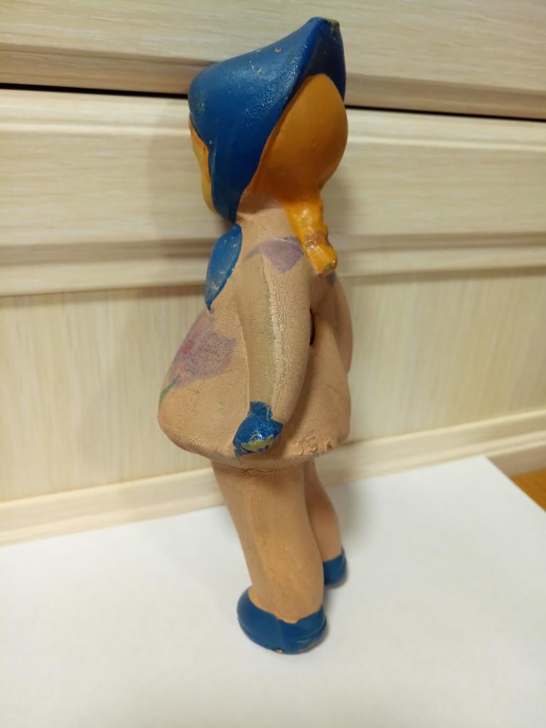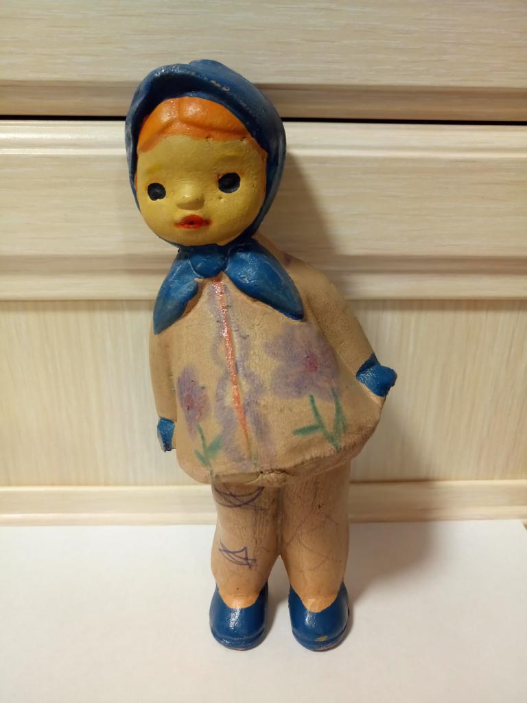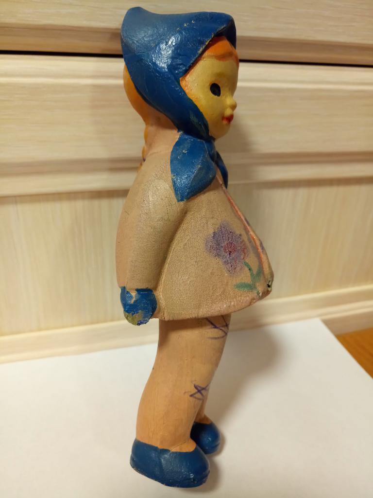 Деформированна (наклон на правый бок). Трещины: под платьем на животе, на косичке, под голенью. Изрисованна. Пищалка провалилась внутрь.