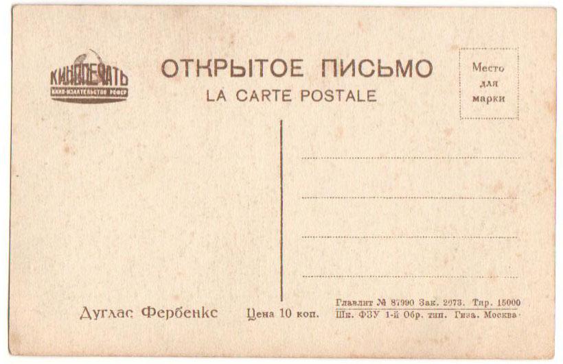 Дуглас Фербенкс. Открытое письмо (открытка). М. Издание Теа-Кино-Печать 192?г. 14*9 см. Состояние: Очень хорошее.