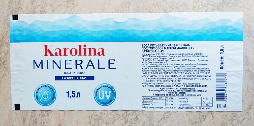 Этикетка пласт. от ПЭТ бутылки. Минеральная вода Каролина 1,5 л