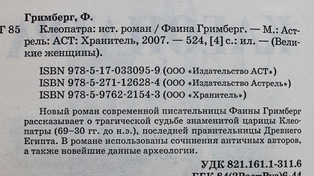 Роман современной писательницы Фаины Гримберг рассказывает о трагической судьбе знаменитой царицы Клеопатры (69-30 гг. до н.э.). последней правительницы Древнего Египта. В романе использованы сочинения античных авторов, а также новейшие данные археологии.