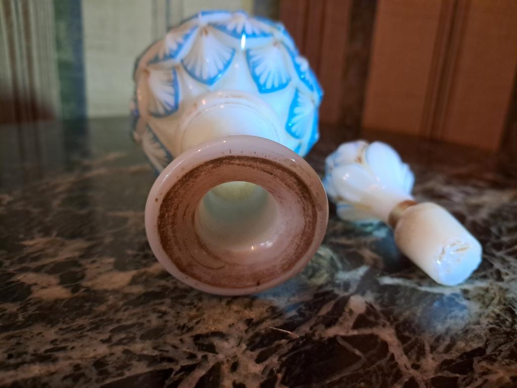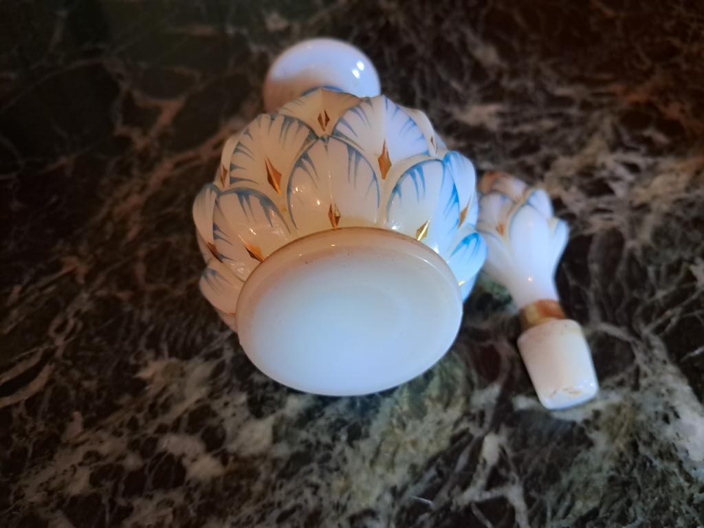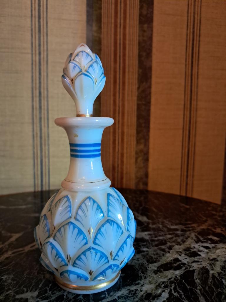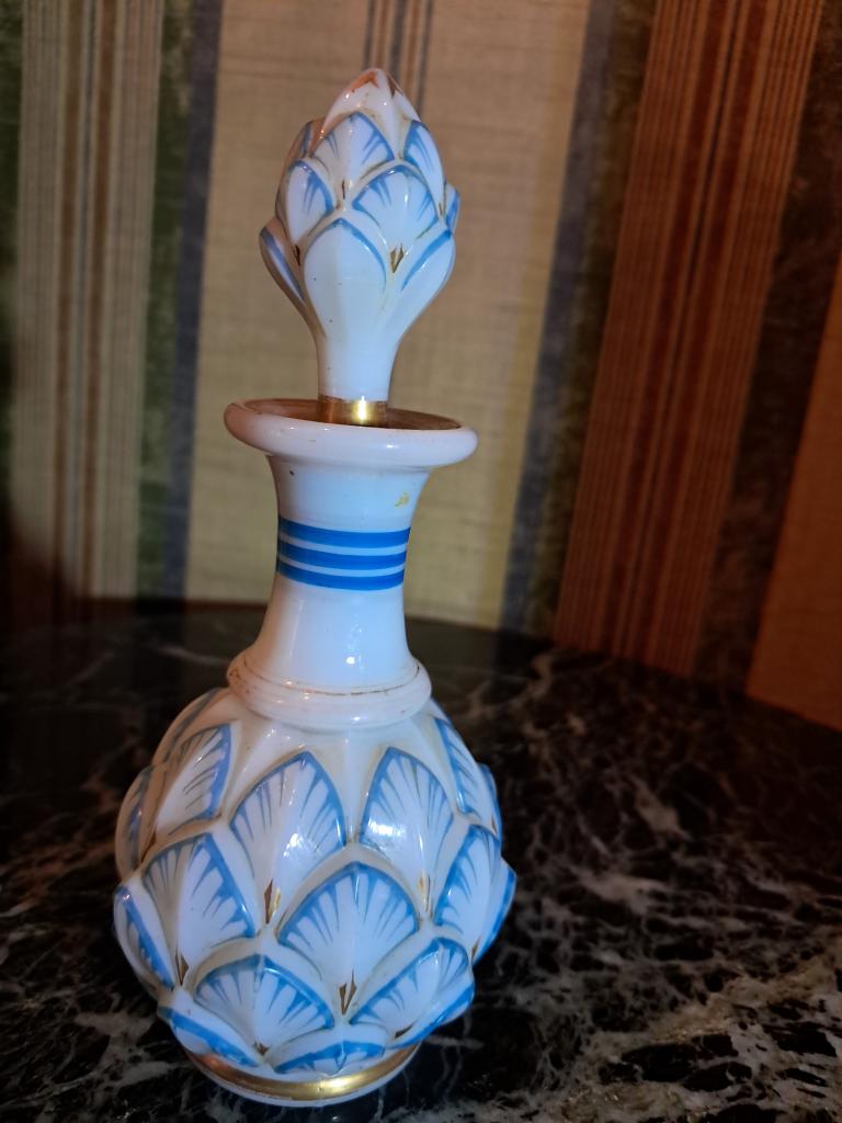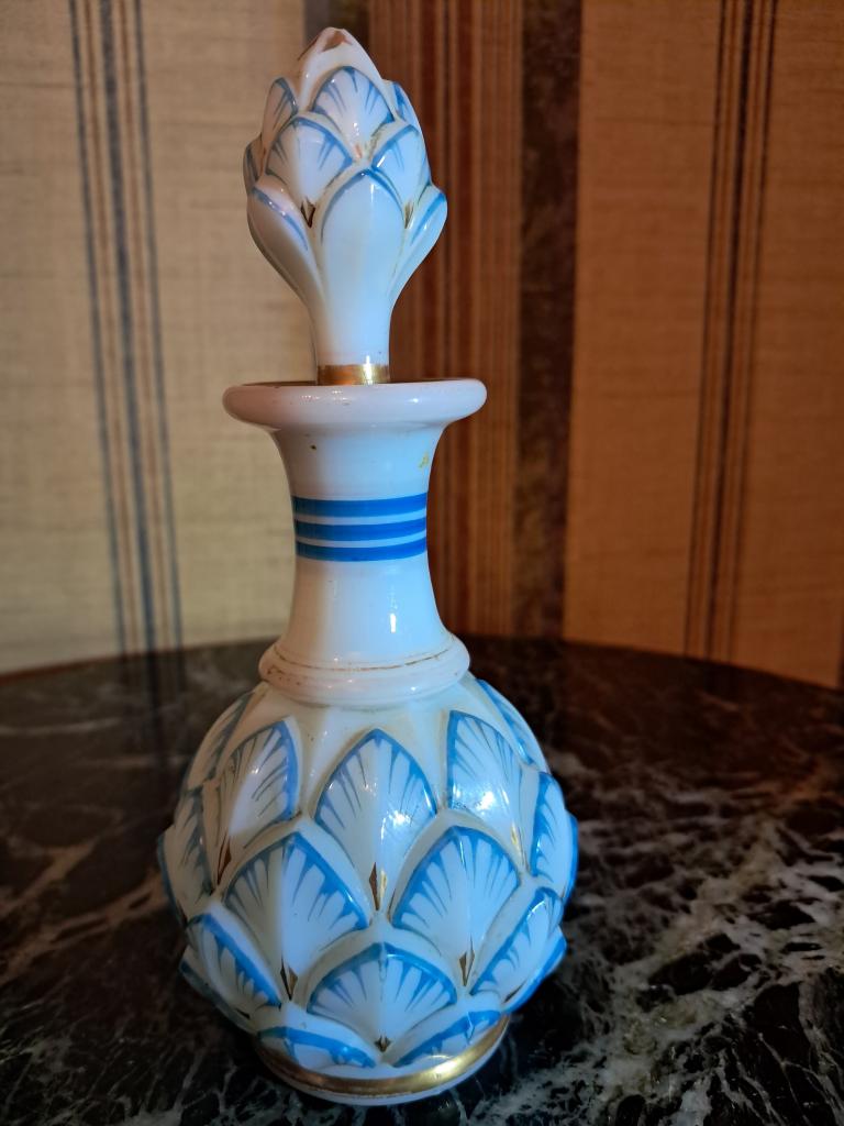 Выдувание в форму. Роспись, золочение. Высота с пробкой 16см, максимальная ширина 7,5см. Без сколов и трещин. (щербинка на стоппере пробки,- это не о чём...). На фото №7 аналогичный предмет из интернета. См.фото.