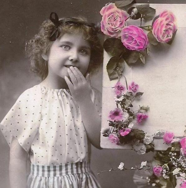 Старинная красивая цветная французская открытка конца 19 - начала 20 века с изображением улыбающейся девочки в окружении роз. Поздравление.