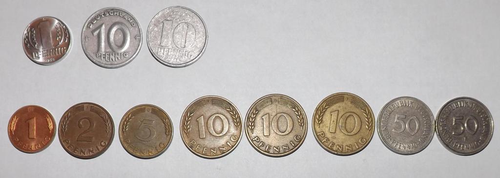 ФРГ 1 пфенинг 1995G, 2 пфенинга 1961F, 5 пфенинг 1950 G, 10 пфенинг 1950J, 1950F, 1950D, 50 пфенинг 1969J, 1990F