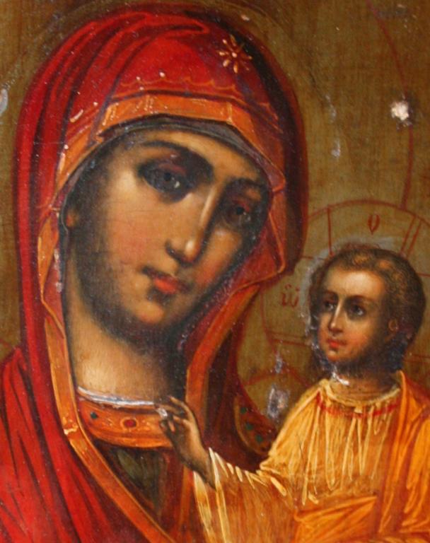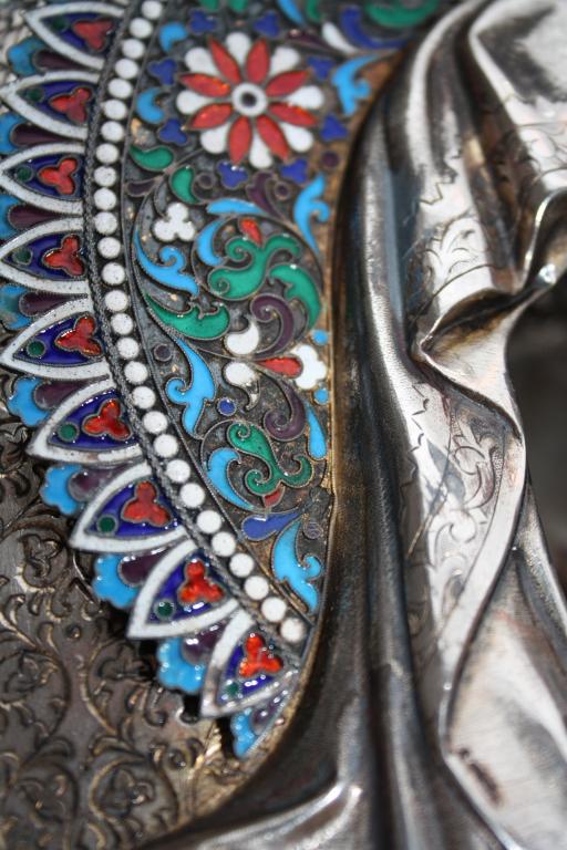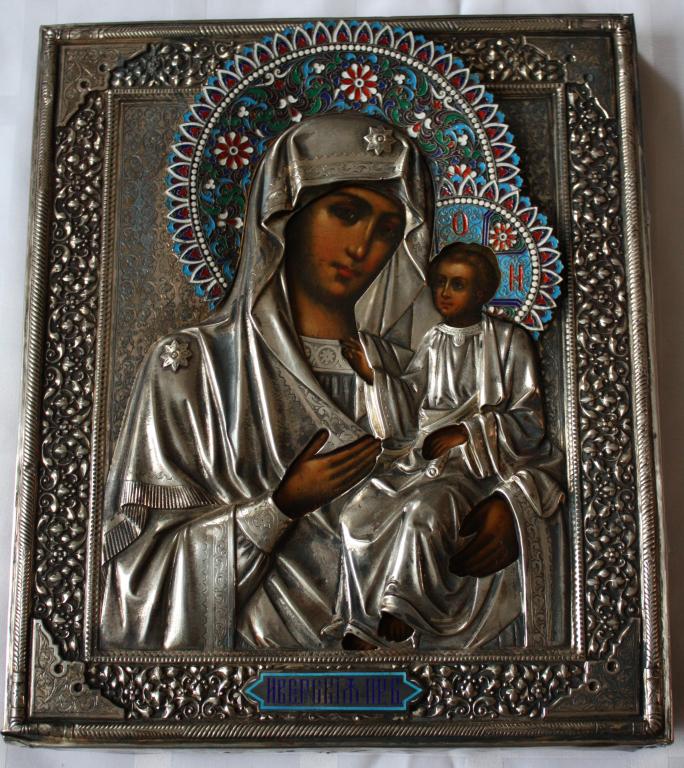Икона «Богородица Иверская» 31 х 27. Россия, конец 19 века. Дерево, темпера, оклад серебро 84 проба, перегородчатая эмаль.