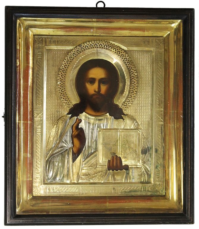 Икона `Господь Вседержитель`. Россия. Дерево, масло. Размер: 26.5 х 21.5 см. Оклад: латунь, чеканка, гравировка, штихель, золочение, серебрение. Деревянный киот, золоченая рама, стекло. Размер киота: 34.0х29.5 см. Кон. XIX – нач. ХХ века. В хорошей сохранности, следы бытования.