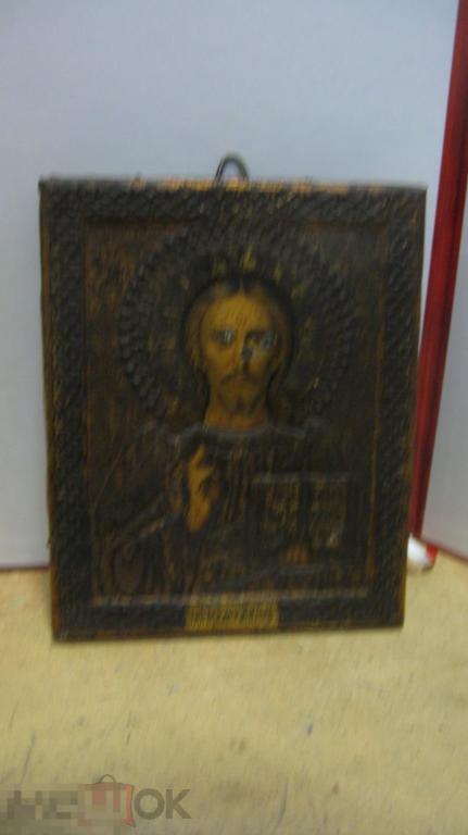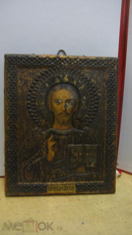 икона Спас Вседержитель 18 на 14 см литография на бумаге в жестянном окладе состояние на фото