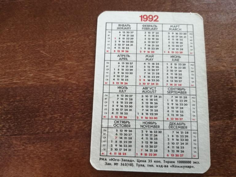 ! Календарь. 1992 г.