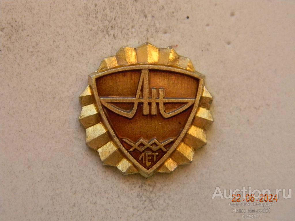 Значок КБ "Антонов", XXX лет, логотип, выпуск СССР, легкий металл, заколка, клеймо САЗ. Состояние на скане.