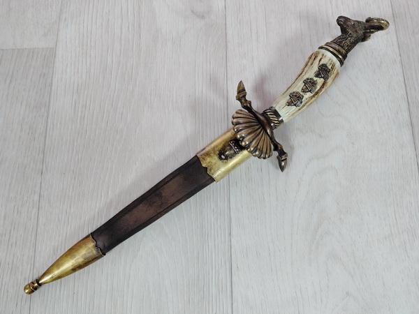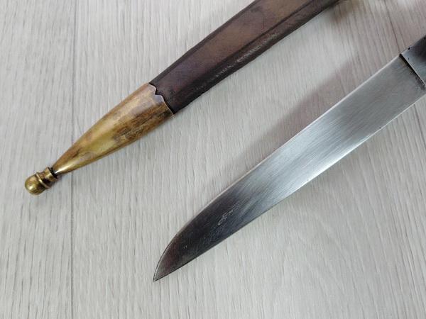 из рога оленя. Ножны из толстой натуральной кожи, с наконечником и