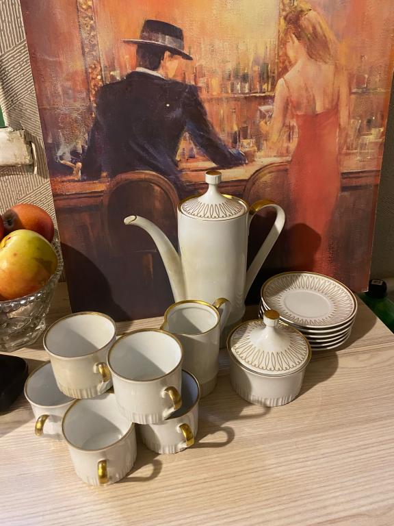 Кофейный сервиз из гдр volkstedt. В наборе кофейник, молочник, сахарница, 6 чашек, 6 блюдцев. На одном блюдце паутинка внутренняя , на кофейнике скол.