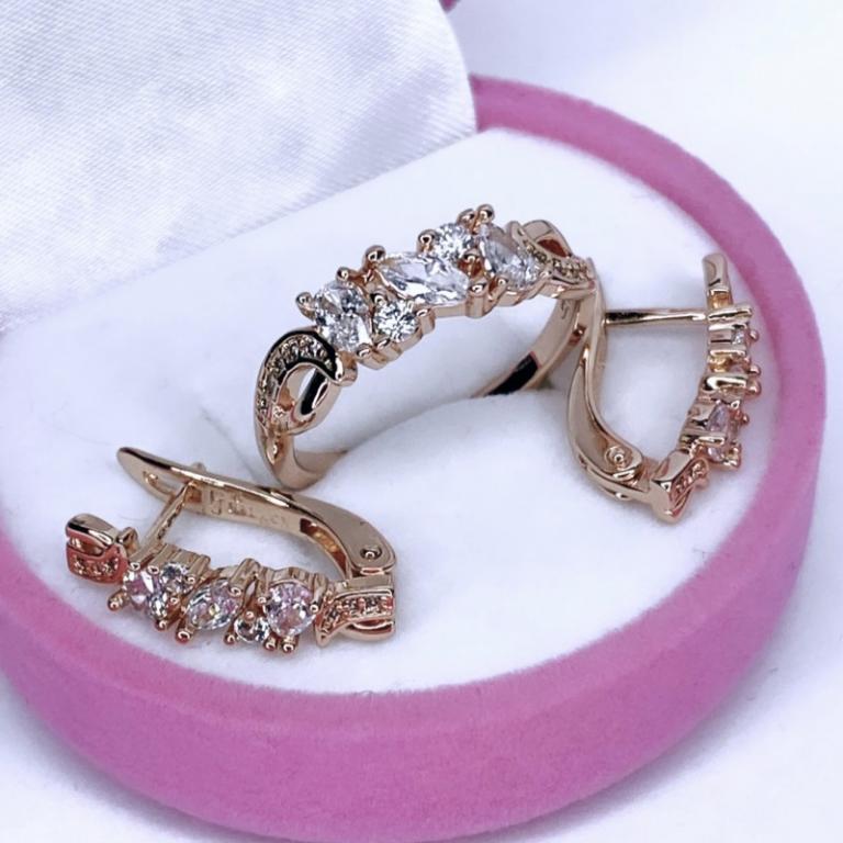 Затейливый дизайн комплекта притягивает к своей обладательницы множество восторженных взглядов. Оригинальная форма изделий, искусно дополненная прозрачными цирконами разных размеров, может создавать как яркий акцент повседневного образа, так и гармоничное дополнение вечернего платья. Невероятно притягательный и нежный, такой комплект обязательно станет одним из любимых в вашей коллекции.