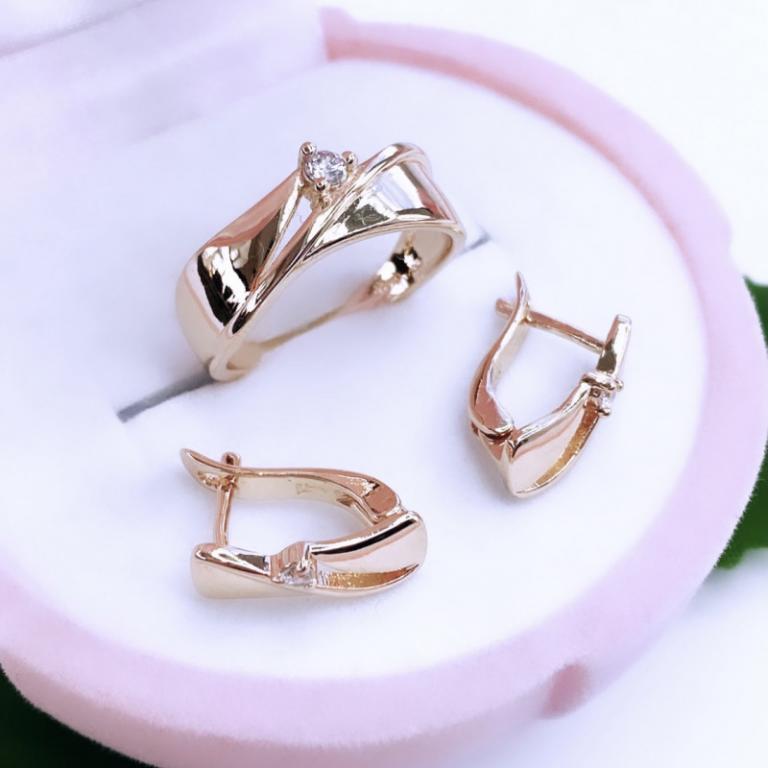 Стильный дизайн комплекта не перегружен лишними деталями. Сочетание оригинальной формы со вставкой из небольшого циркона, выглядит лаконично и сдержанно. Игривый блеск прозрачного минерала добавляет изделиям изюминку, а их обладательнице уверенности в себе и неповторимого шарма. Этот комплект станет прекрасным дополнением как для делового, так и для свободного образа.