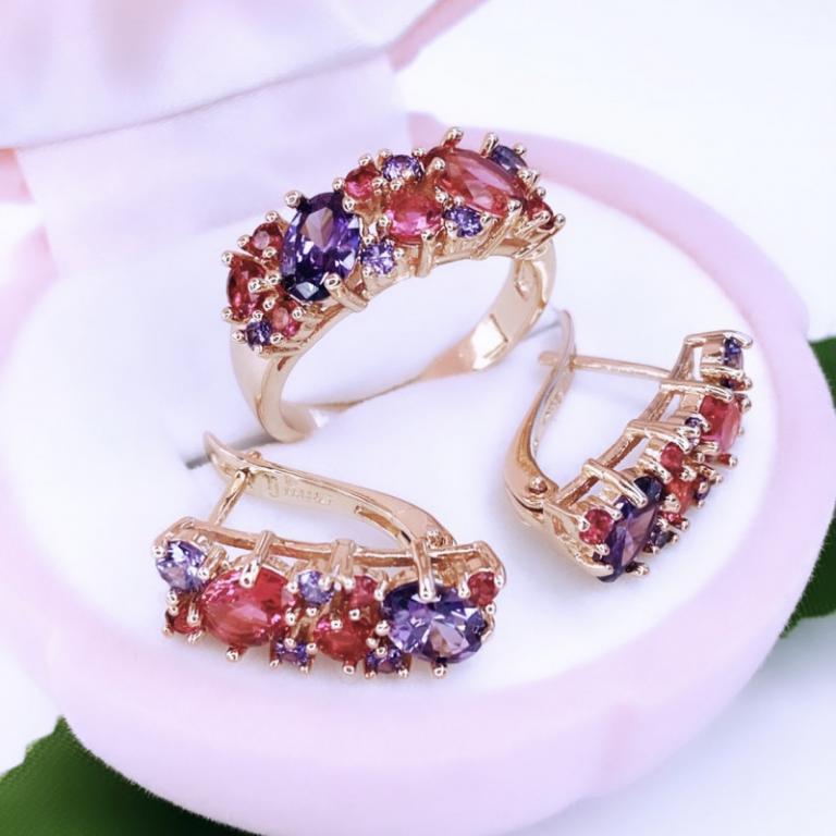 Выразительный комплект, состоящий из серёг и кольца, непременно выделится на фоне множества других украшений. Микс камней, формирующих аксессуары, одновременно яркий и нежный. Дизайнерам изделий удалось подобрать великолепное сочетание цветов, которые не смогут оставить равнодушной ни одну ювелирную модницу. Такой комплект способен стать основой многих стильных образов.