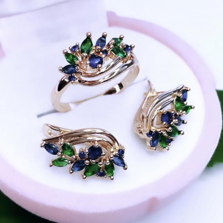 Эффектный комплект, состоящий из кольца и серёг, прекрасно подойдёт жизнерадостной и свободолюбивой представительнице прекрасного пола. Яркое сочетание синих и зелёных минералов, представляющих собой форму небольших лепестков, привлекает внимание и подчёркивает индивидуальность своей обладательницы. Хотите блистать и выделяться среди окружающих? Этот комплект создан специально для вас.