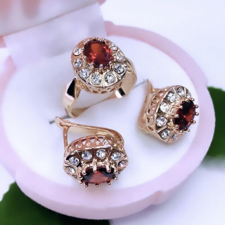 Роскошный комплект из серёг и кольца обладает выразительным и ярким дизайном. Рубировый минерал, дополненный сиянием прозрачных цирконов, манит к себе взгляды окружающих словно магнит. Такие аксессуары придутся по вкусу харизматичной и уверенной в себе представительнице прекрасного пола, стильно подчеркнув офисный костюм или дополнив вечерний образ.