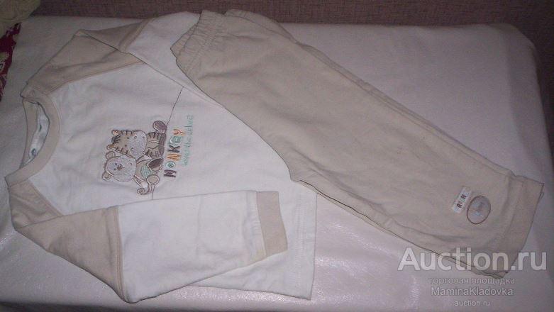 Комплект трикотажный примерно на 1,5 года. Штаны: шаговый шов 24см, длина от талии 42см, п/о бедер 25см; джемпер (на плече кнопки): длина по спинке 32см, длина рукава от горловины 35см.