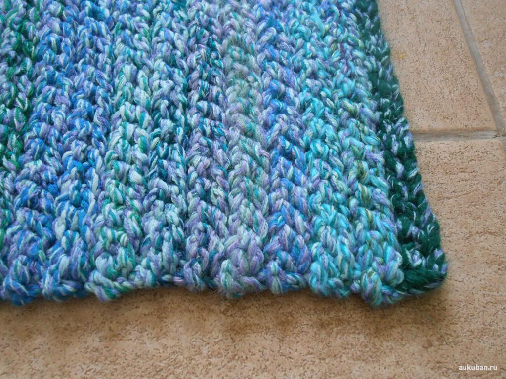 Тяжелый плотный шерстяной коврик. Средний размер - постелить перед кроватью креслом. Под ногами пружинит. вес 2,9 кг. Изготовлен, в основном, из шерсти с добавлением синтетической нити для износостойкости. 80х97 см, толщина 1,5-2 см, Уход: стирка на режиме "шерсть". Смотрите Мои лоты - вязаные коврики, юбочки, шарфики!