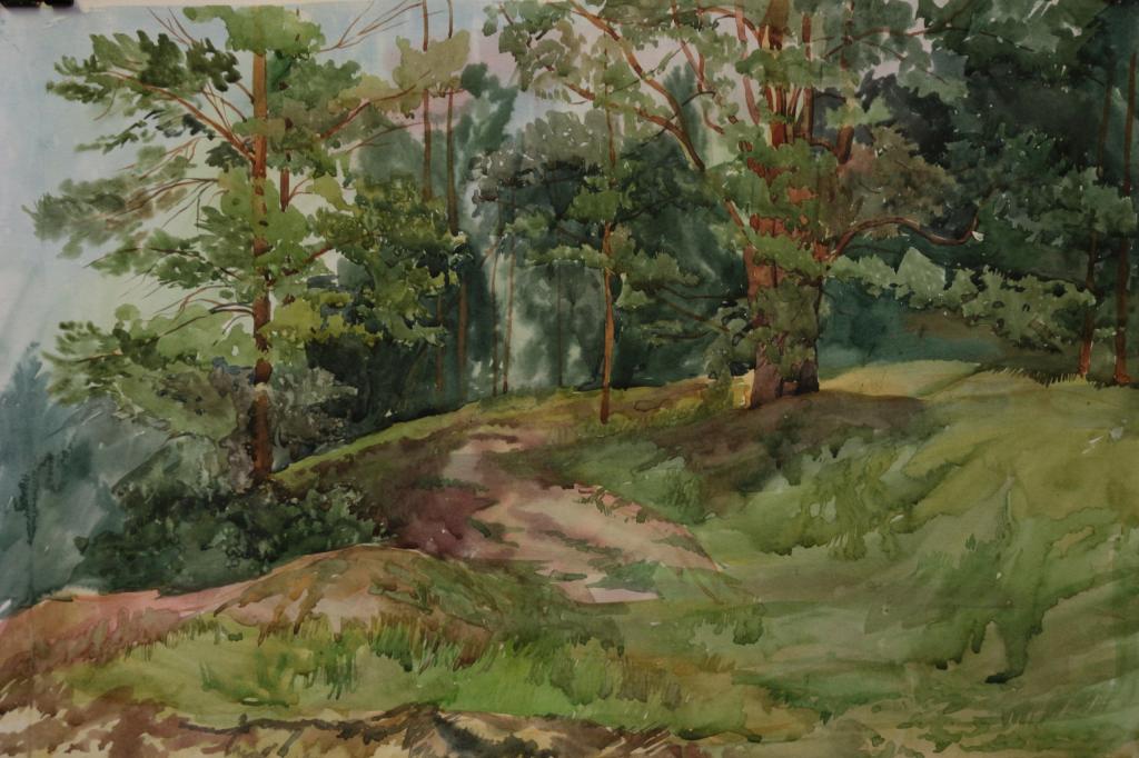 Это был дождливый денёк, в лесу стоял влажный запах хвои и смолы, земли и цветов. На работе даже остались следы лёгкого дождика. В работе передано именно то спокойное состояние природы, красота леса, ощущается дождь.