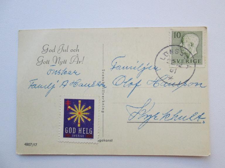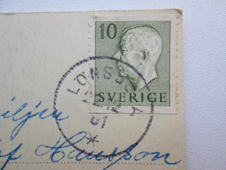 Лёнсбода.Редкая шведская открытка и редкий почтовый штемпель.Дата на штемпеле 22 декабря 1951 года.Марки God Helg и рулонная за 10 оре.
