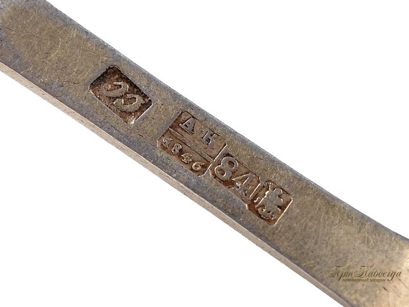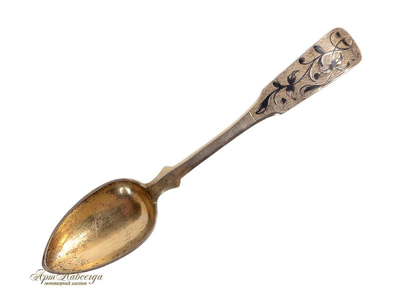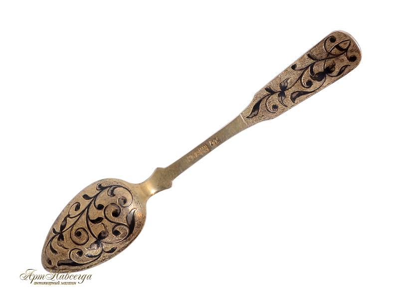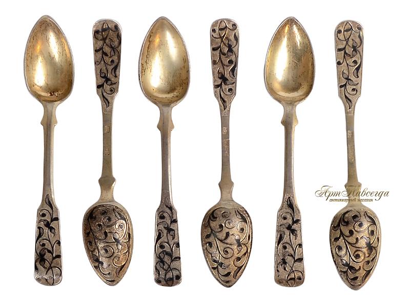 Чайные ложки, изготовленные в технике черни мастером "СС" в 1846 году из серебра 84-ой пробы.