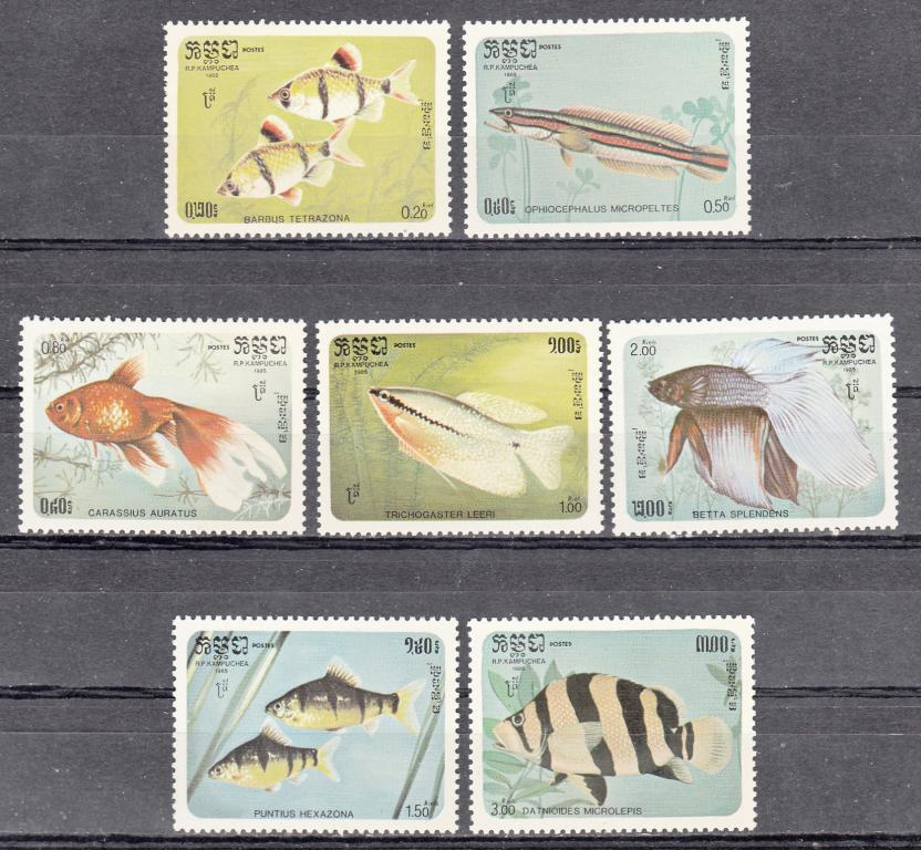 Марки.  Кампучия.  1985.  Рыбы.  Фауна. Купите "Марки. Кампучия. 1985. Рыбы. Фауна." по цене 280a.