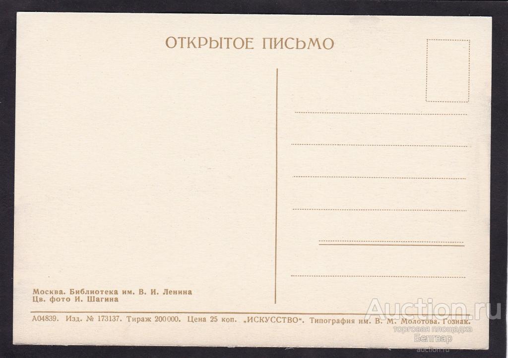 Купите "Москва. Библиотека им. Ленина." по цене 50a.Покупайте сейчас, чтобы не упустить эту отличную цену на “Auction.ru”.