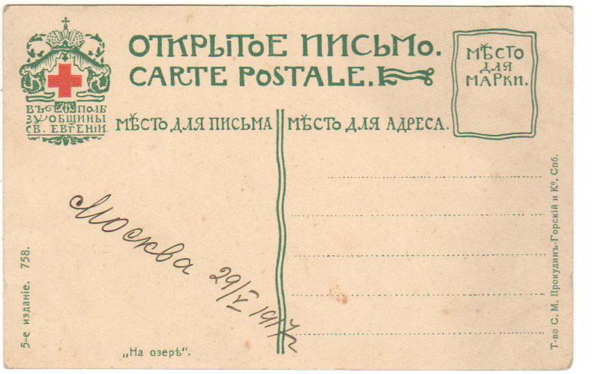 На озере. Открытое письмо. СПб Т-во `С. М. Прокудин-Горский и К 191?г. 14*9 см. Состояние: Очень хорошее.