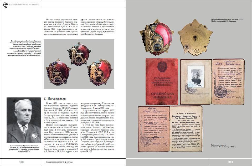 Книга богато иллюстрирована и хочется специально отметить, что многие награды, документы и фотографии публикуются в ней впервые. Также впервые дается расширенный список орденов, учитывающий все многообразие их вариантов и разновидностей; также включены и некоторые пробные знаки. Большой удачей стала возможность описать и сделать качественные фотографии единственного известного экземпляра пробного ордена Трудового Красного Знамени Украинской ССР образца 1925 года, а также пробного ордена Трудового Красного Знамени Закавказской ССР. Обнаружены и описаны в книге ранние варианты орденов Трудового Знамени Армянской ССР и Красной Звезды 3 ст. БНСР.