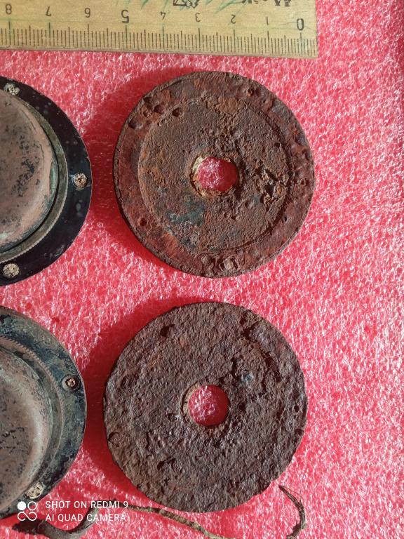на фото оригинал копанина состояние на фото найдена на Курской дуге в местах боёв латунь кругляшки железо крепкие остатки краски почта и комиссия на покупателе