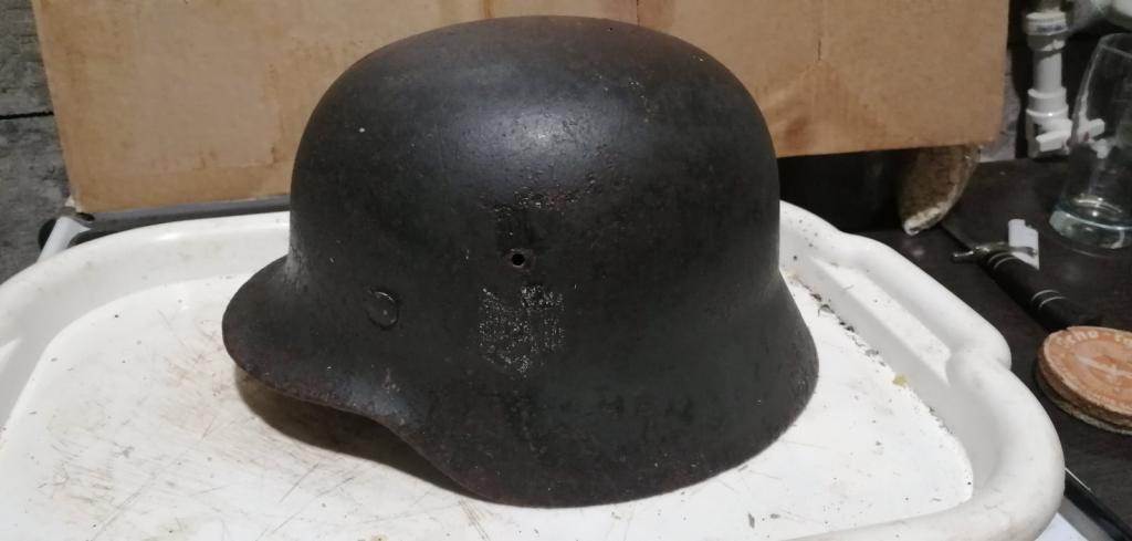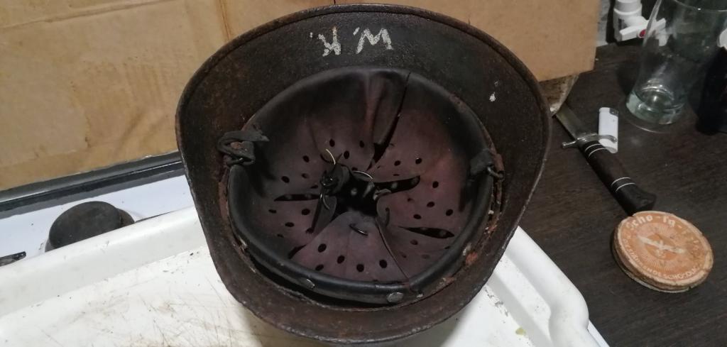 Немецкая каска м35, 64 размер. Выкопана под Сталинградом. Полностью в родном перекрасе, родной подшлем. При очистке обруч и кожу подшлема не снимал. Кожа эластичная. От подбородочника остался зацеп. еидео с раскопа. В перекрасе обе декали закрашены, при желании можно очистить. Подписана W. K и еще закрашеная подпись